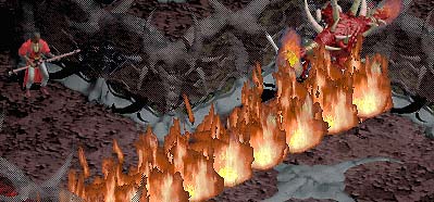 in Hell that has a safe side where you can wait out Diablo's death throes. What should happen is Diablo will start looking for you and try to get as close to you as he can from your last known position - which is where you teleported to, as the game is aware when you cast a spell. Diablo will move up and down the wall trying to get around it and reach you. He'll travel about 6 squares in either direction. Meanwhile he is running back and forth, up and down through the length of the Firewall. If you think he gets exposure from just standing in a multiple Firewall, wait until you see him run through one! Why does this kill him so quickly? Because a creature moving in Diablo spends a bit of time in 2 squares at once, and will automatically be hit by anything affecting either of those squares. As you can imagine, when you have a lot of Firewalls, that's a lot of 'being affected'. ; ) I used to use Stone