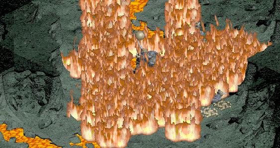 Casting directly in front of me, the FW on the back row lights PW up (thanks Charis and KoP for showing me how to cast this). I skip a row with the visible dog in it, then cast another on the next row closer to me to show how the game is treating that half fence square. Solid, eh? This is one way to wipe out PW and his pack in Hell/Hell with no armor and no physical weapons . That covers caves