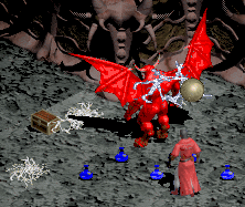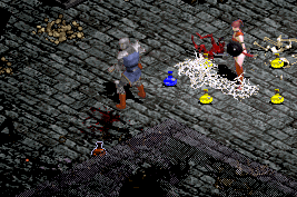 do you use with Charged Bolt? Charged Bolt is a good attacking spell from a distance, in that it can cover wide open spaces very effectively and it can also inflict a good deal of damage up close. Lets look at covering open spaces first. The caster is asked to try for taking up a doorway or a corner of a large room. Taking a corner, cast a couple of Charged Bolts towards the diagonally opposite corner of the room. As the bolts dissipate, they will hit the monsters present and either kill them or inflict some damage. Those that survive the first wave are "woken up" and will come to the caster. Since the caster can see the bolts dissipate, s/he can see the monsters who have come past the first wave. Quickly cast another 2-4 lots of Charged Bolt. The advancing monsters will be almost completely exterminated, at the least literally decimated. (Note: this may not be the case if this method is used in Hell/Hell on Steel Lords and Hellspawn, but at least you will know about the monsters' presence and switch to different spells and/or tactics. It certainly works in Normal/Hell.) If using this tactic from a doorway, be sure to stand in the door and cast straight out, else the side-bolts will go to waste if the caster stands behind the door. Follow this up with 1 step forward and casting straight out to the sides of the room. In any case, do not cast like a mad(wo)man until all your mana is gone, rather cast the spell in small bursts for maximum effectiveness. If there are ranged attackers on the level, then be prepared to step back through the doorway and off to the side. Charged Bolt travels slowly, so don't give the monsters a chance to get to you first. It may seem at times that many monsters escape the bolts, however, this is not so. They are merely weakened by every hit as the split bolts deliver less damage per monster-hit at a distance than they do up close, so let's look at the up-close tactics. As noted before, make sure that the monsters are not standing in a blind spot, so either they move or you move. The latter is recommended when there are ranged attackers present on the level as well. It must also be noted that sorcerors are very fast at casting Charged Bolt, so as soon as a monster gets next to you, select the monster with the mouse and right-click. The monster will now have to bear the full payload of a third of the total bolts the sorceror has just cast. Say the spell level is 15, that makes (3+slvl)/3 = (3+15)/3 = 6 bolts. For a sorceror with 120 magic, that is a range of damage of 6*(1) - 6*(1 + 120/4) = 6 - 186 damage for the one hit. And you still have the side-bolts which continue to spread themselves around. There are other tactics for Charged Bolt, especially in conjunction with other spells and weapons, but they are left for the reader to find. - Last notes! The only thing to remember when using Charged Bolt is not to right-click away like a lunatic, a tactic which may work for Fireball and Lightning on occasion, but rather use some thought about its deployment. Charged Bolt travels much too slow for immediate high-impact, so be prepared to duck around a corner at times while the bolts do the dirty work. Yours Truly has successfully used the Charged Bolt spell at level 15 in Normal difficulty and cleared Hell/Church completely with a level 31 Sorceror without using a Mana Shield, albeit with the help of Stone Curse for various bosses and unique monsters.