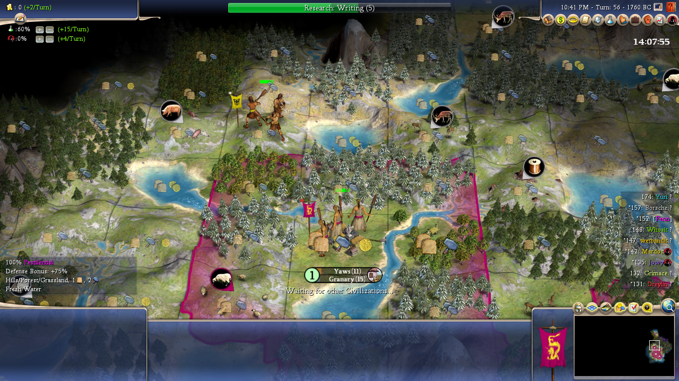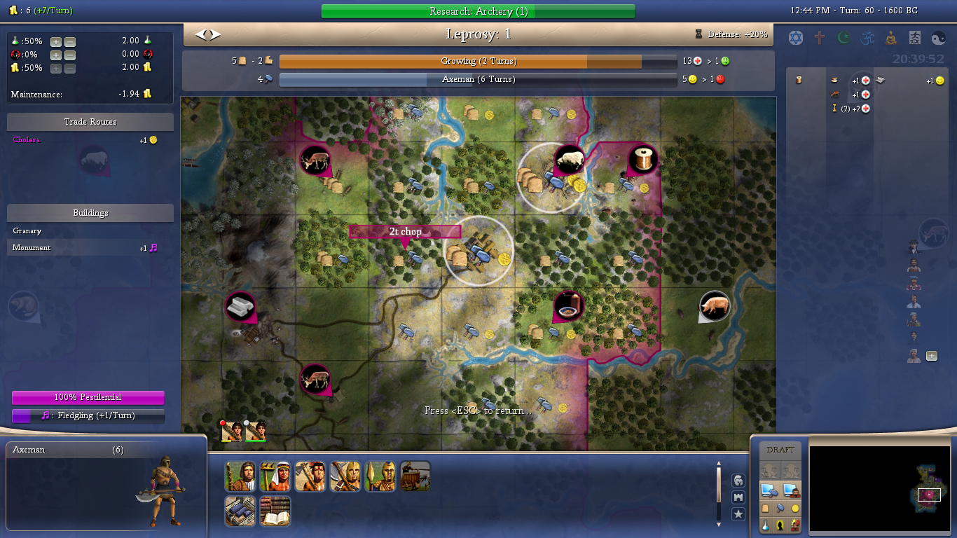 -Cholera got a chop and will overflow into a worker. Plague is about to grow to Size 6, but only has 5 good tiles to work so I'll whip a Settler before that happens. Next city will be the the spot due west of Plague.