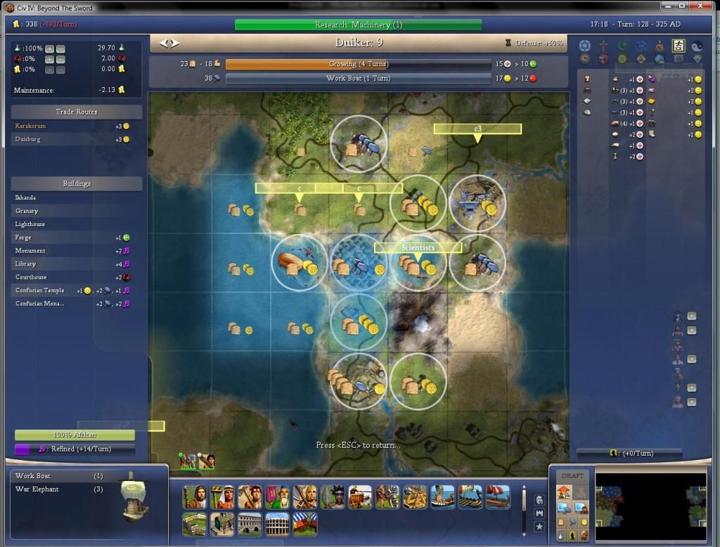 Produced two War Elephants (Giraffe & Duiker). Started a Work Boat (1 turn w/o whip) in Duiker followed by another Welly. Was pondering the idea of doing a stable after the WB, though – thoughts? It’ll only take 3 turns and give some extra XP to the Wellys, which seems worthwhile to me.