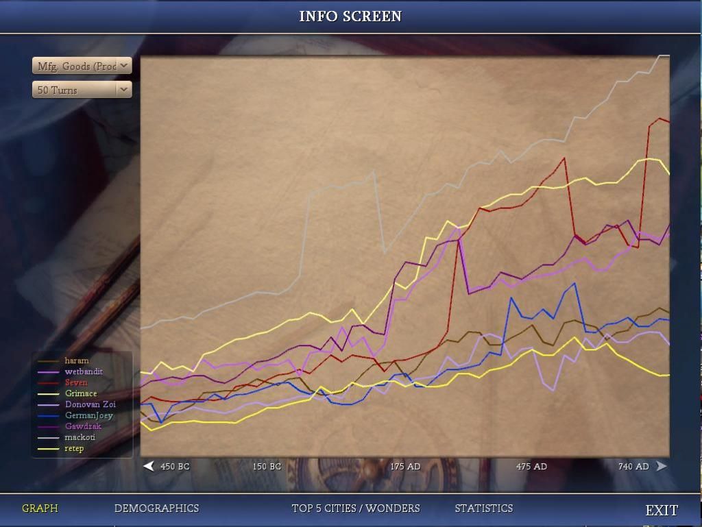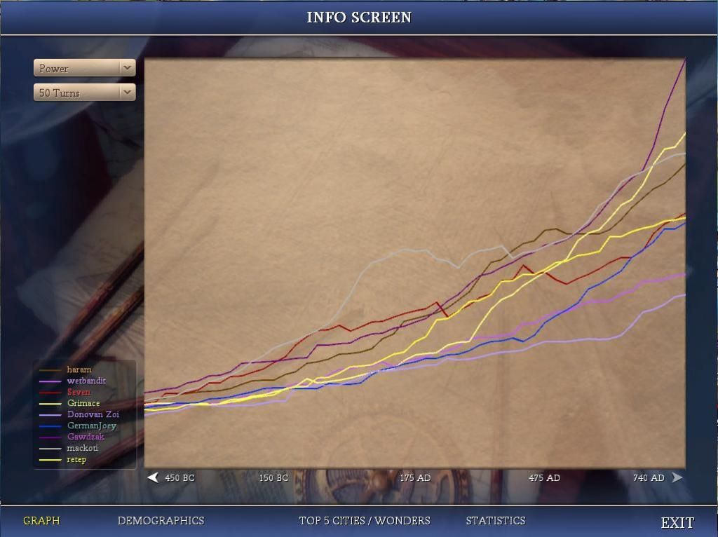 Very middle of the road here. Not sure how wetbandit is so far ahead of us unless he has amazing land, but the others are ahead of us largely because they have bigger empires.
