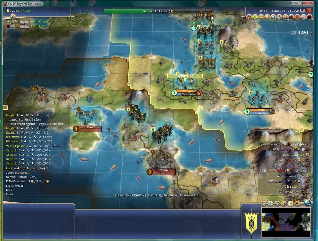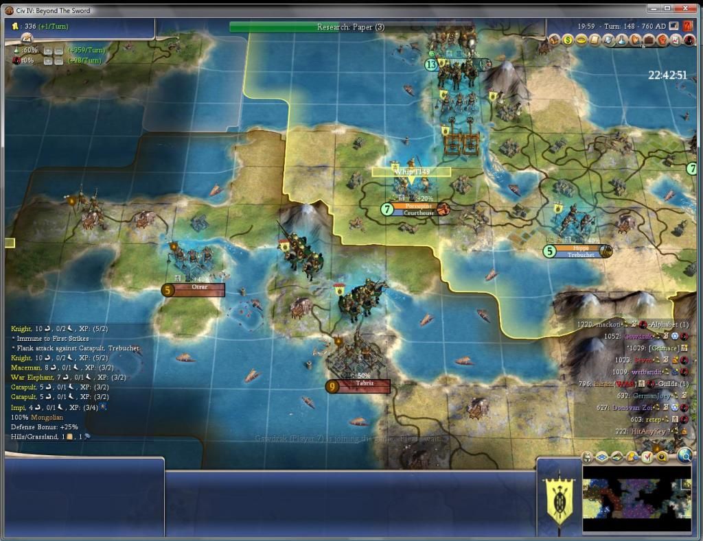 I'm hoping that GJ will be able to take his Ballista Elephants (which he now has available due to the Ivory I gave him -- I've seen them in his territory) and start spanking haram's Keshiks. Haram also has maces now -- one has appeared in Tabriz, either promoted or moved. Probably promoted, because there are now 6 units there, one of which is a catapult. I'll have my first treb next turn, and will have another the turn after that. Probably not in time for Tabriz, but they'll be available for the next city.