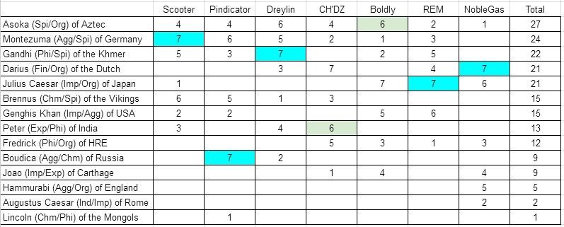- Though only picked by 4 players, Japan surprisingly ended up being the most hotly contested civ with two 1st's and one 2nd. I am sure most of this is the IMP/ORG combo, but I'll have to revisit the Shale Plant to see what the big deal is there.
