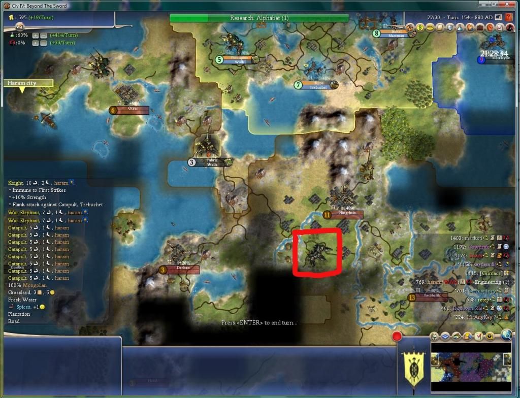 In world news, Gawdzak got a GM. Haram captured a city of GJ’s, so indeed it looks like his Keshik stack is at work. I think he's willing to leave those cities to their own defense for the moment so he can engage more on GJ's side.