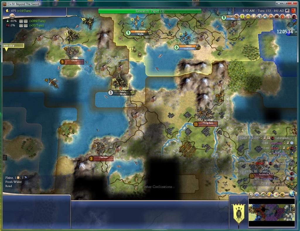 I've been watching the demographics, and I'm fairly sure the only person doing more science than me at 100% is mackoti. haram has a surprising amount of unimproved land, whereas I'm cottaged up the yin-yang.