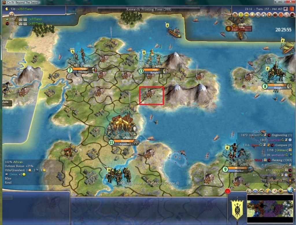 Mackoti got Liberalism this round. I suspect he probably nabbed Nationalism, so we may see the Taj being built by him within the next 10 rounds and drafting is going to suck when he decides to attack me. GJ and haram both generated Great Generals, so there must have been some battle between them I could see…possibly GJ making an attack on one of his ex-cities.