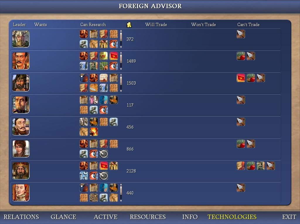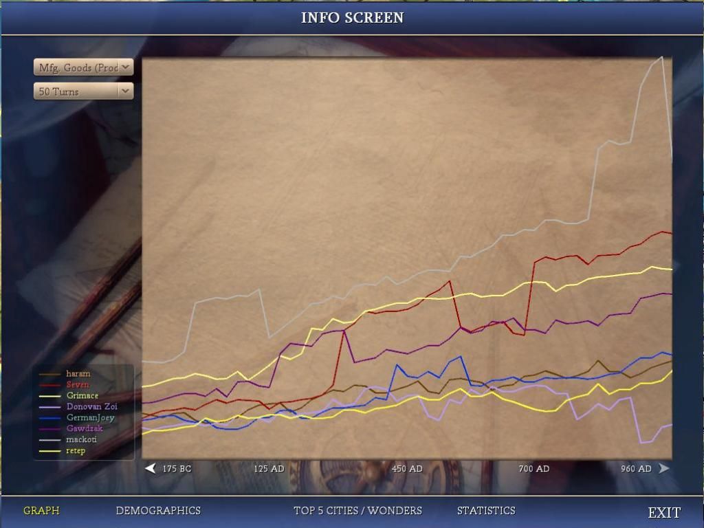 (October 22nd, 2014, 04:56)Old Harry Wrote: Presumably Haram's GNP is uninflated by religion/wonder culture, your GNP is less indicative of your research power... You should be able to use an F1 screen at 0% and 100% to figure out how much of your GNP is research power.