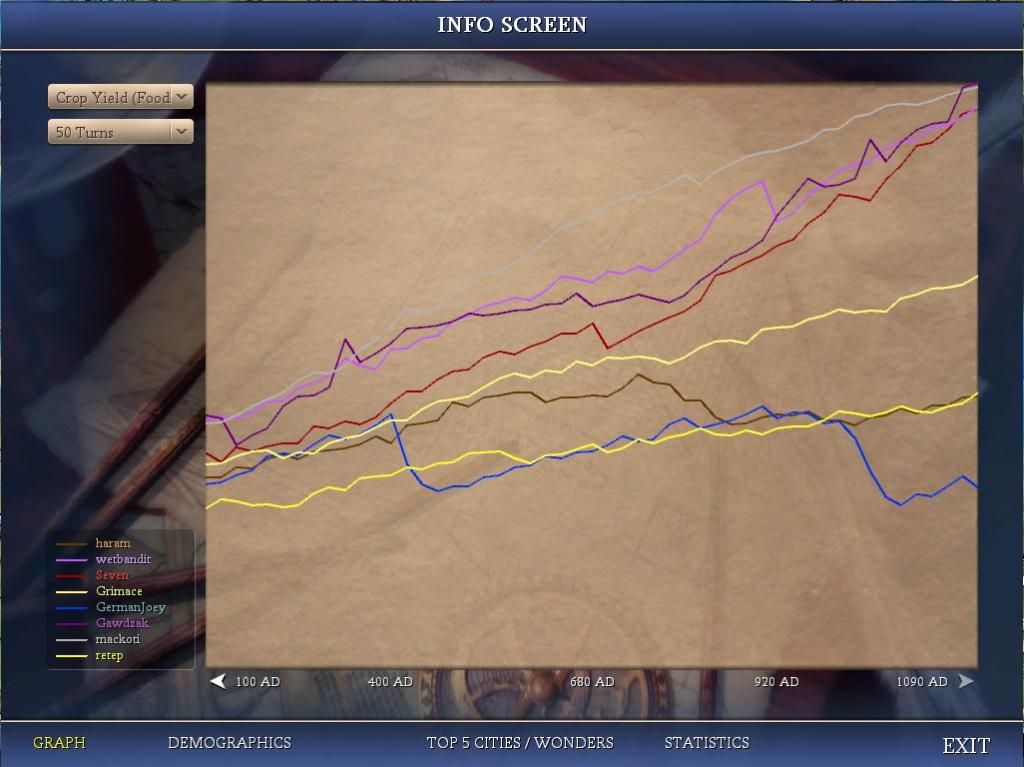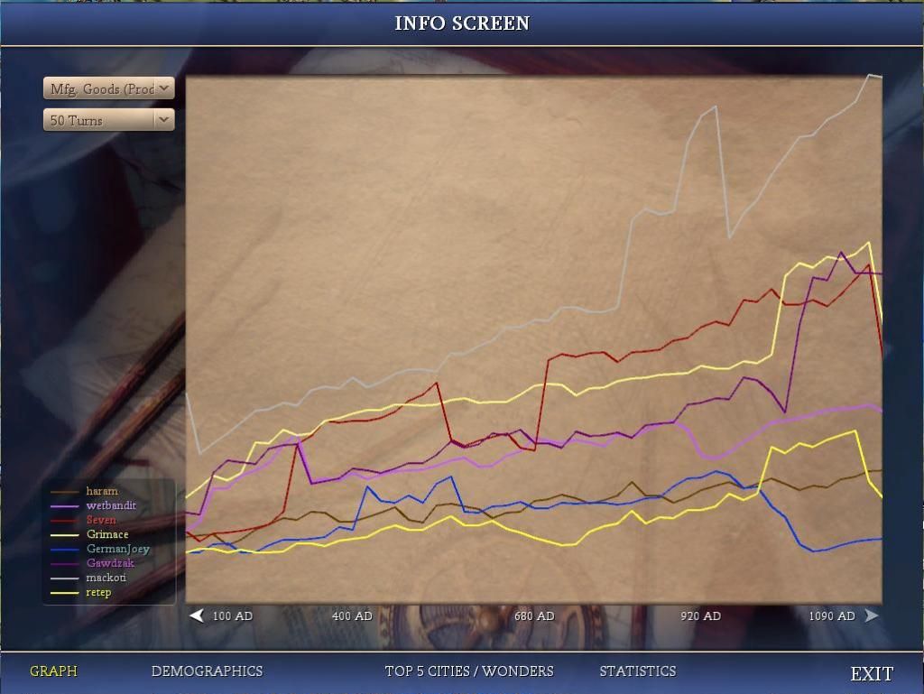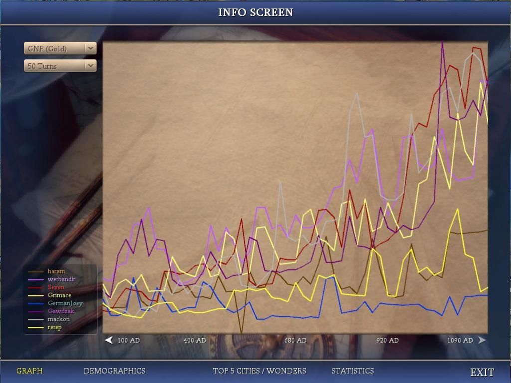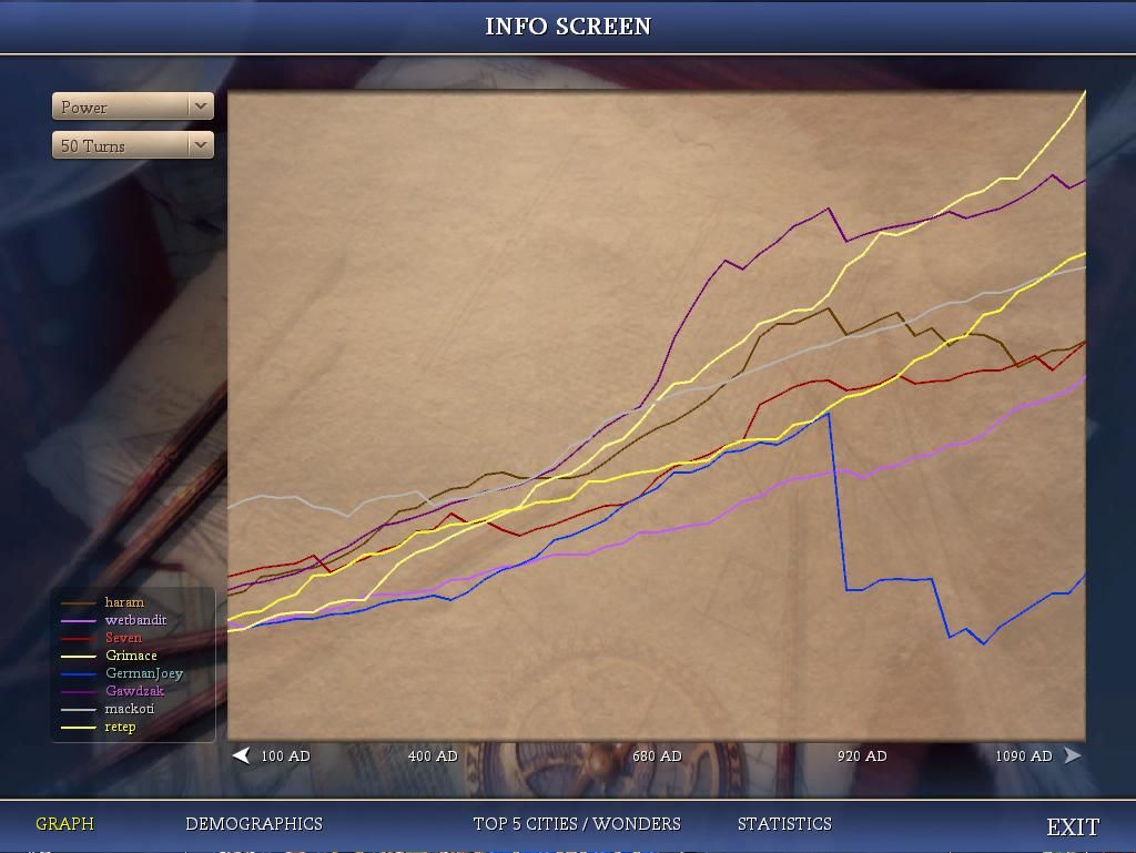 We are now the most powerful force in the universe! We’ve passed Gawdzak in power, and I should be ready to resume the war on haram in no more than 2 turns; mostly waiting for units to arrive in Wildebeest. Graphs haven’t changed to reflect our post-GA stats yet, so I’ll wait until next turn to post them.