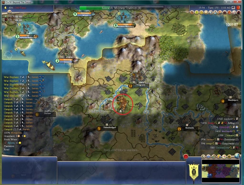 Haram is still going for Chemistry and it shows 2 turns left, but he only has 52 gold in the bank, so I’m certain he’ll have to switch off 100% science this turn. Seven is going for Rifling, and will have it in 4 turns. We’ll have Nationalism next turn and will be going for Military Tradition next. I juggled EPs again…working on city visibility on haram (2 turns), and research on retep, Gawdzak and mackoti. Mackoti is basically as far ahead of me in score as I am of haram.
