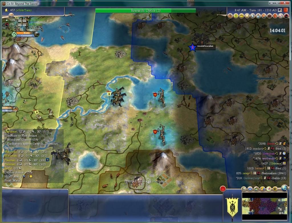 I'll try to put up a summary of the strategic situation later today when I get home from work. But in general, what is the best way to handle this type of situation? Hold all offensive actions until I can build an overwhelming force? He's teching towards Steel and Cannons, which in the short term will be a serious issue, but in the long term will not be as much of one once I reach Rifling and Cavalry.