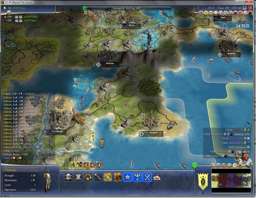 15 galleons, almost certainly full of Riesengardes. Last turn there was a stack of about 20 of them ready to board, and now the stack isn’t there anymore. I suspect I’m not the target he really wants to go after, or he never would have offered the deal, but they could hit my closest city to there in 4 turns or so. I’ve also still continued building cuirs in anticipation of upgrading them to cavalry later.