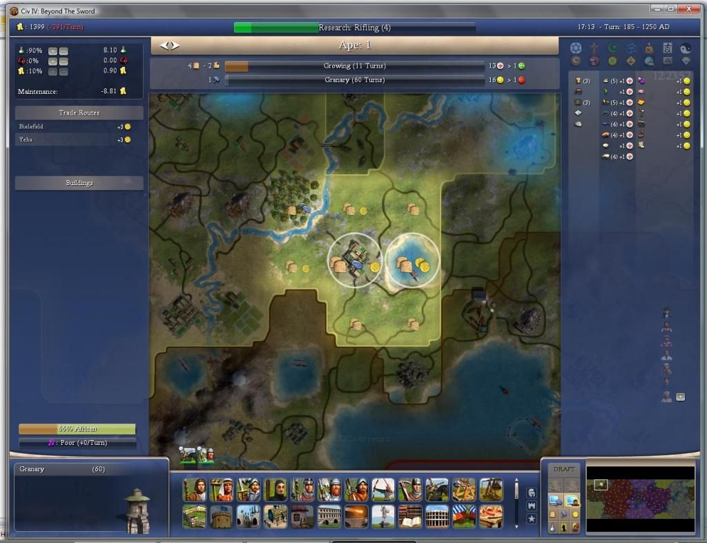 We’re still probably 6 turns from Rifling. Since mackoti took our lunch money, it’s going to be another turn of building wealth before we can switch to 100%.