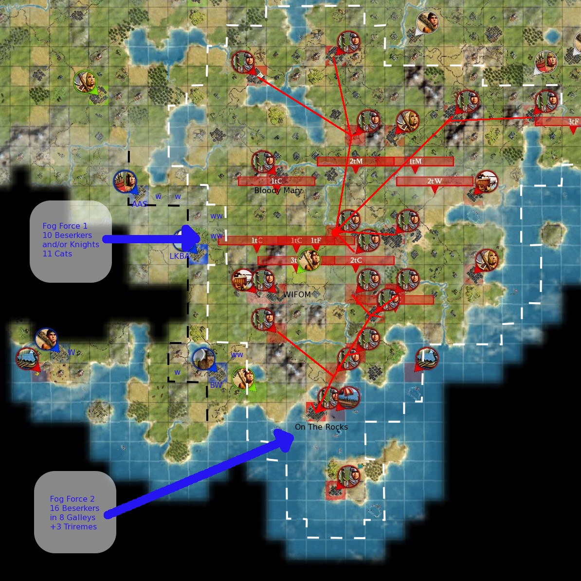 My planning has been pretty sloppy lately. All 3 of my games needing my full attention is a bit too much. However I'll try to get Castle up in OTR and as many maces as possible. Only other coastal city we really want to preserve is MoM one, but we can live even without it. Hoping ~8 maces on OTR on T140. That should be enough to keep the city in case all their galleys have 2 Berserkers in them. I'll be drafting OTR twice and bring some maces from nearby cities also there. We'll lose our island holding and possibly GT, but those are way less important cities. Island can whip mace before the action starts. Focusing on triremes might also be worthwhile. They don't have that many of them to protect their boats, but there just are too many priorities here.