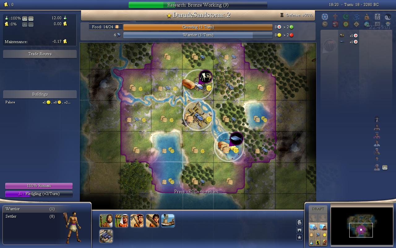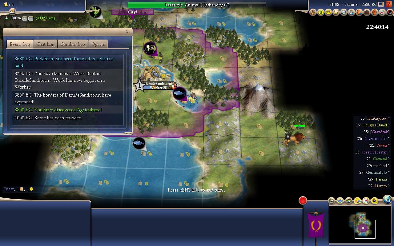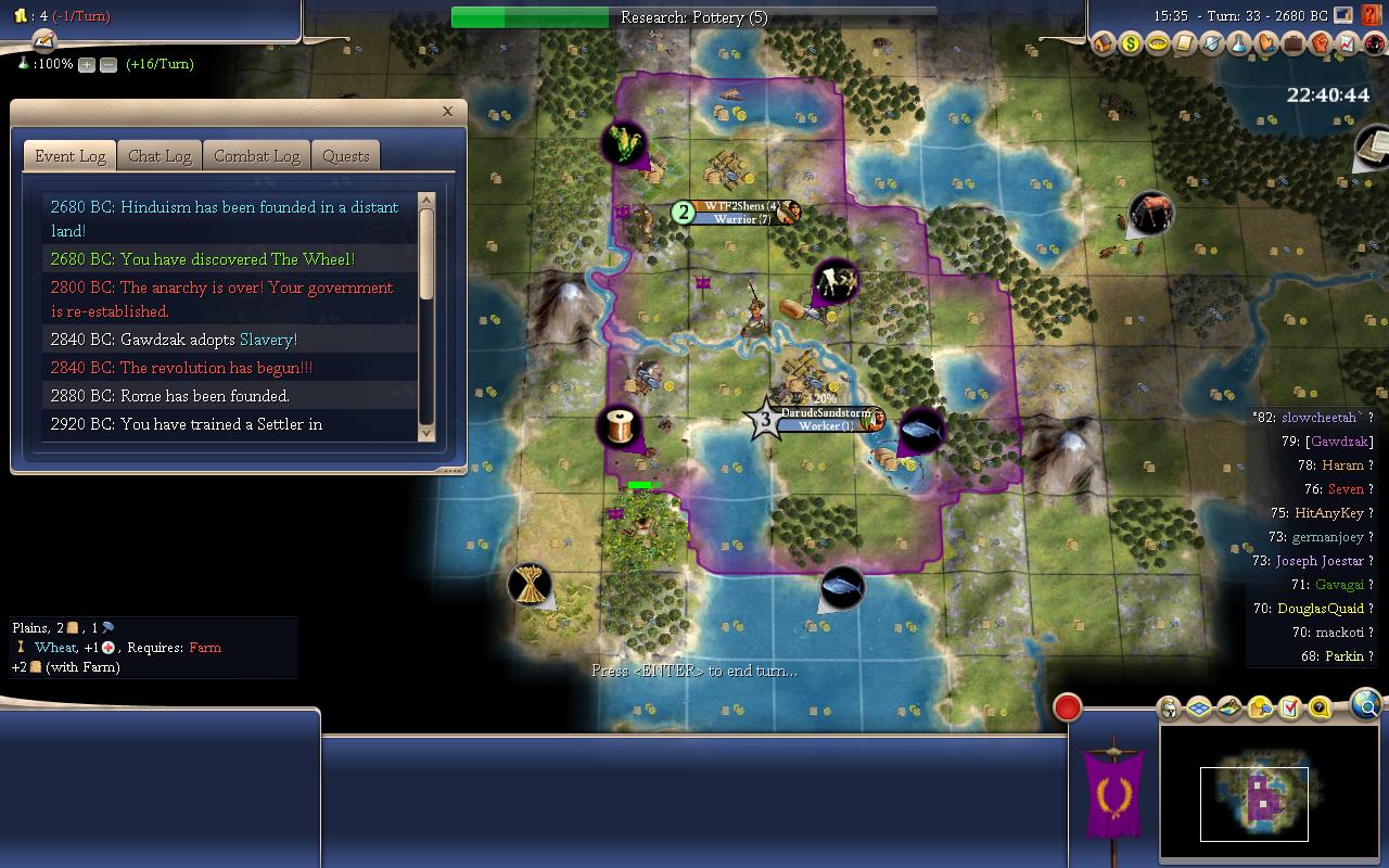 Slowcheetah on the other hand,grew a pop and discovered a tech. He is the Vikings(Fishing/Hunting) and he has discovered 3 techs so far.We are on T18 so that means there is ~180ish total beakers(or is 170?) researched for each player.So did he go Agriculture-Mining-Wheel?Or did he go Agriculture-Mining-Mysticism going for a Hinduism run?(Buddhism founded) Not sure it's possible to do Mining/Wheel/Mysticism with the tech cost on this map(Huge/Monarch). I hope(for his sake) that he doesn't go for the religion,because he is playing as Nipples(Charismatic/Organized),he doesn't need the happiness that badly and going for an early religion would slow down an,in my opinion,already slow starting leader.