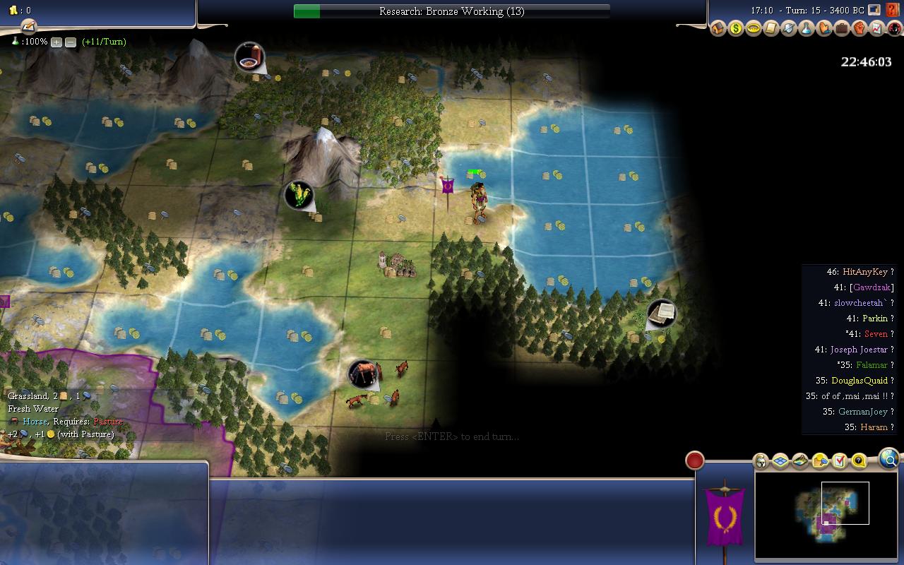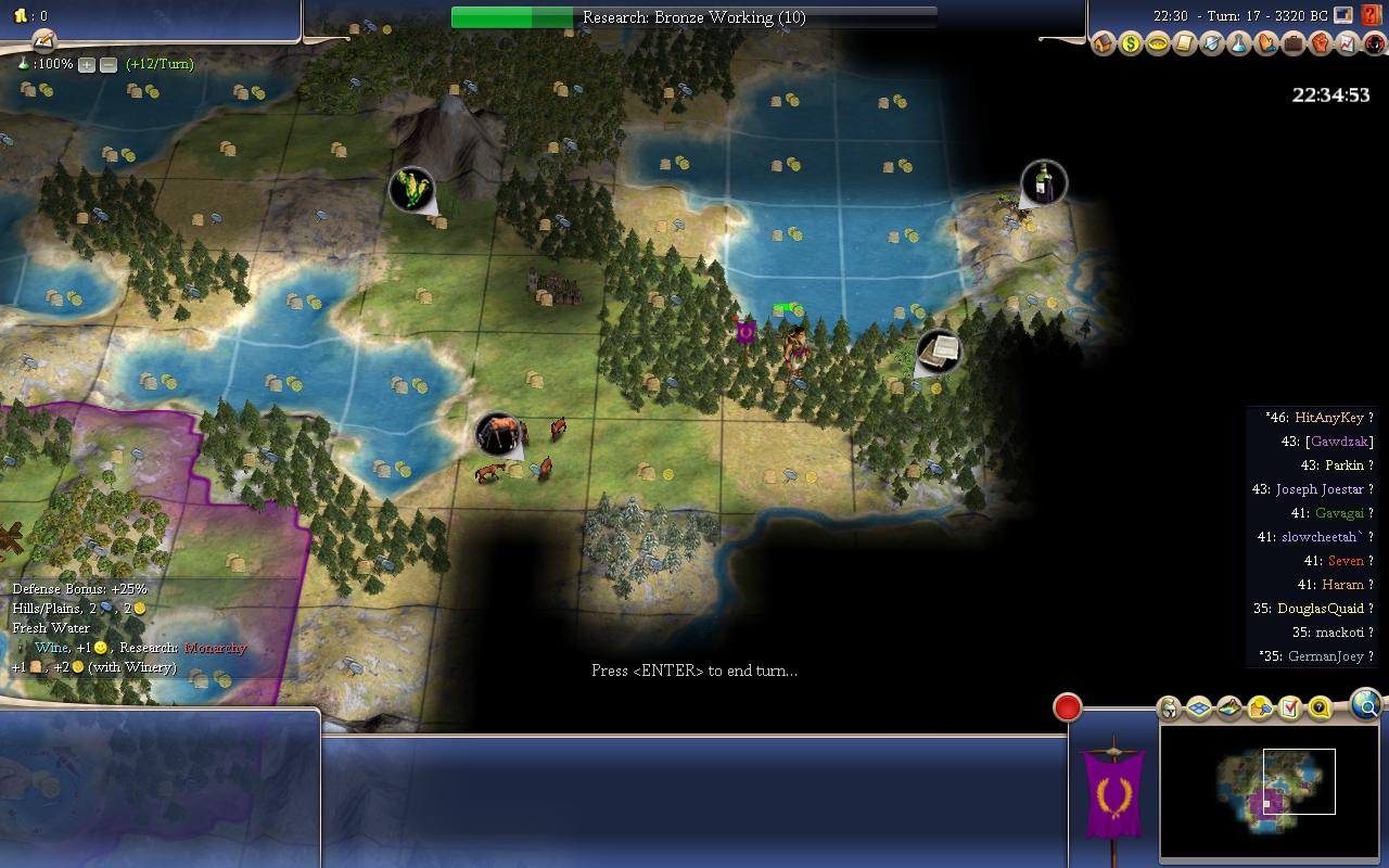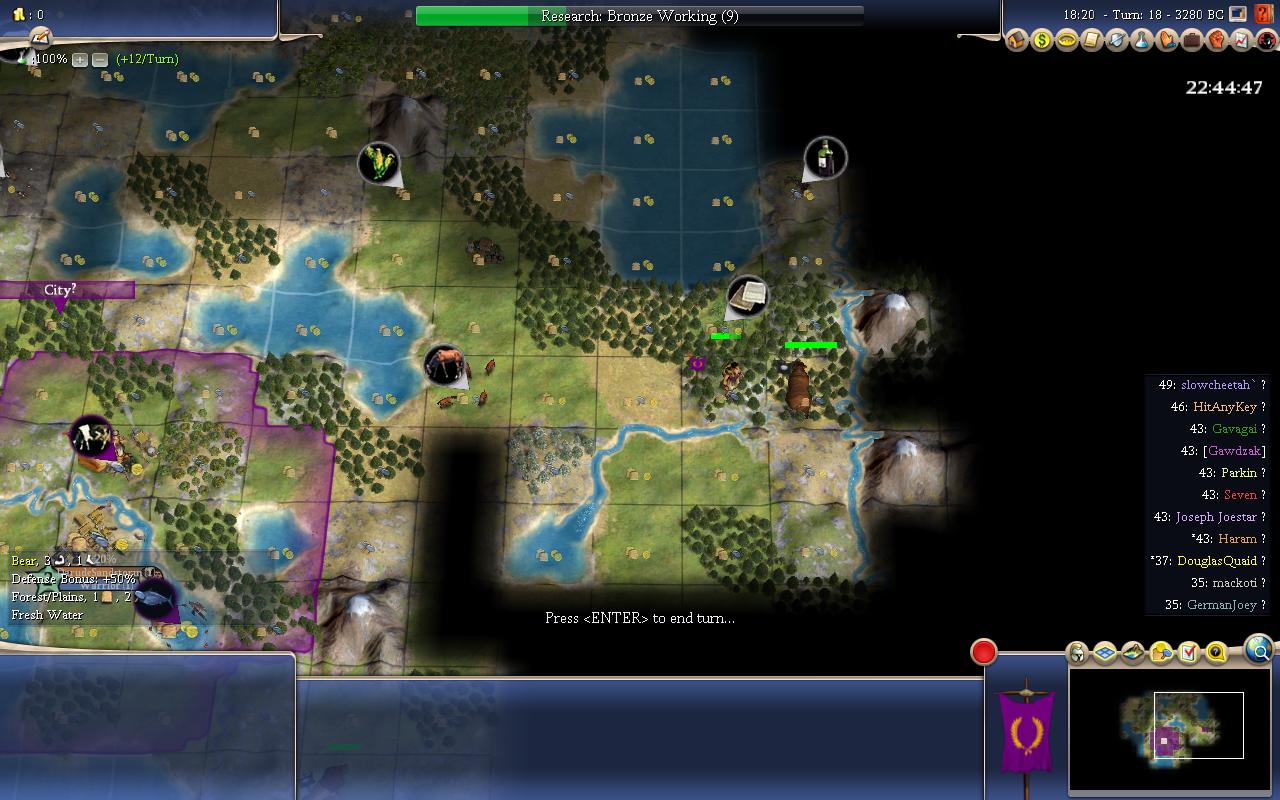 From the score,only GermanJojo and Mack haven't grow to size 2 yet. Mack seemed to went Bronze Working first(he got his first tech at T15 or so IIRC).He is Productive and Imperialistic,so he probably wanted to go BW to chop workers and settlers,that makes sense.So from the demos,he is probably the one working hammer tiles and not growing (rival worst crop yield) and is currently chopping a worker or a settler. GermanJojo was the one who moved on T0,and didn't go Bronze Working first(he has discovered a tech in my T13 screenshot) and he still haven't grew to size 2 yet.Was his move worth it in the long term?We'll see.At least both players have Imperialistic and will have less problems getting out settlers.
