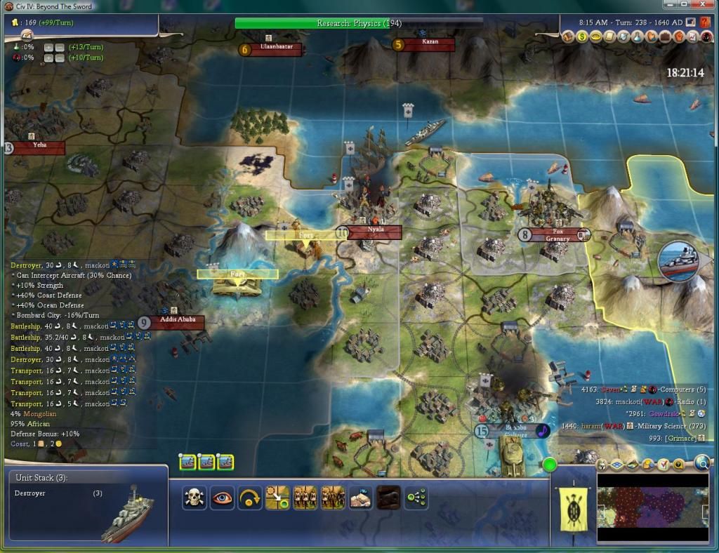 Anyway, I definitely just screwed his plans for an amphibious invasion of my remaining cities, and I really hope those transports were full of troops because that would make me so happy! I also have another 8 Frigates that I could use against his galleons if I can get them in range, though I lack the funds to upgrade them (at 99gpt). Really makes me wish I had gone Physics instead of Biology, as that would be far more useful right now if I had some airships to soften up his naval units.