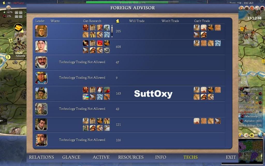 So right now we're not up on them with any techs, and they are up on us: Buddhism, Archery, HBR, Alphabet, Aesthetics, Literature, Music, Philosophy, Feudalism, Divine Right, Paper, Guilds, Compass, Optics, Nationalism, Printing Press, Banking, Constitution, Military Tradition, and Astronomy. Next turn they will also be up Engineering, but I will get Paper