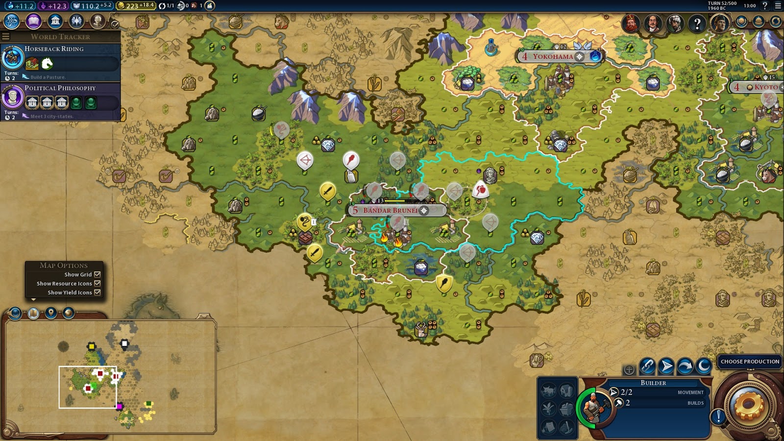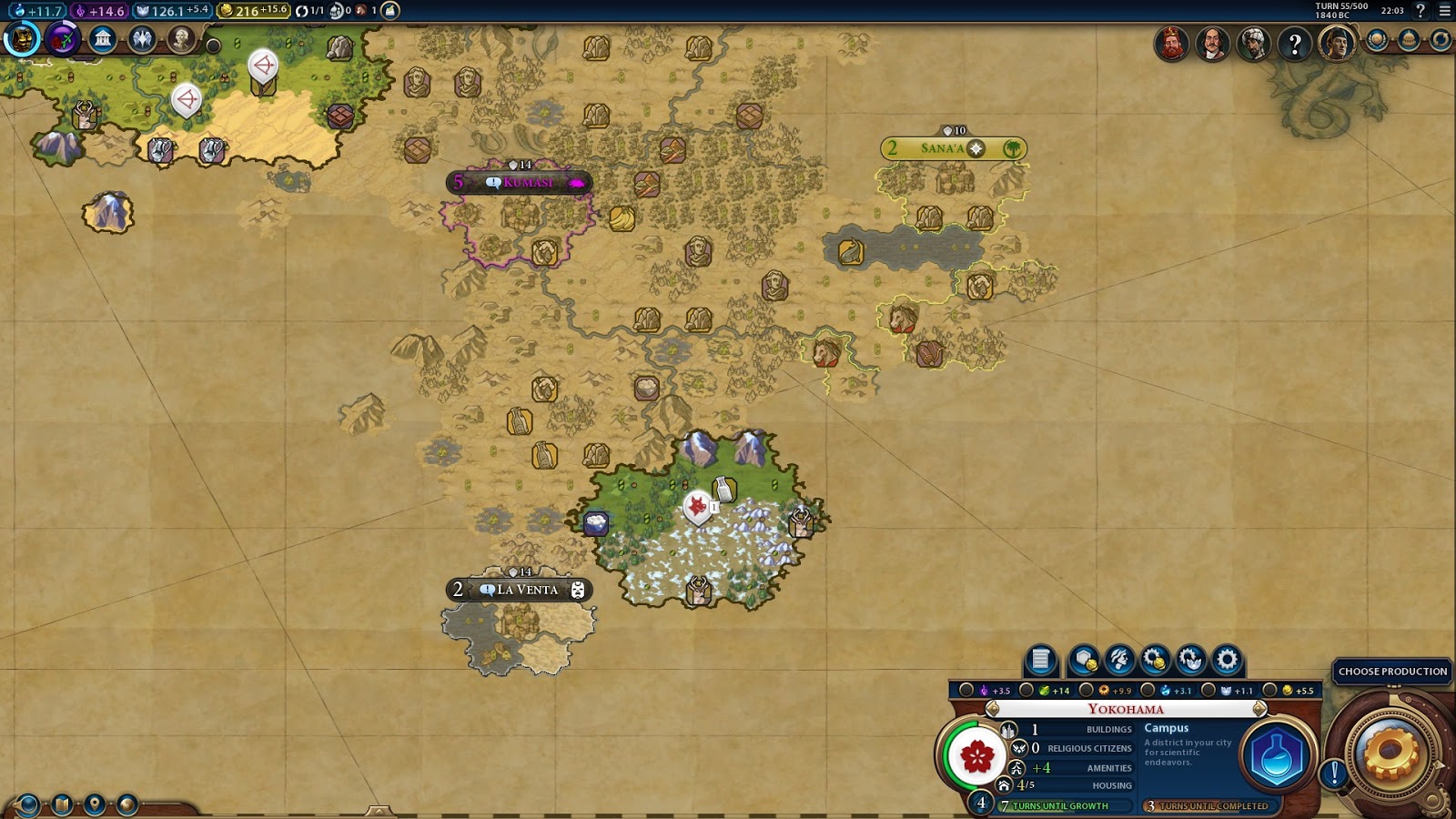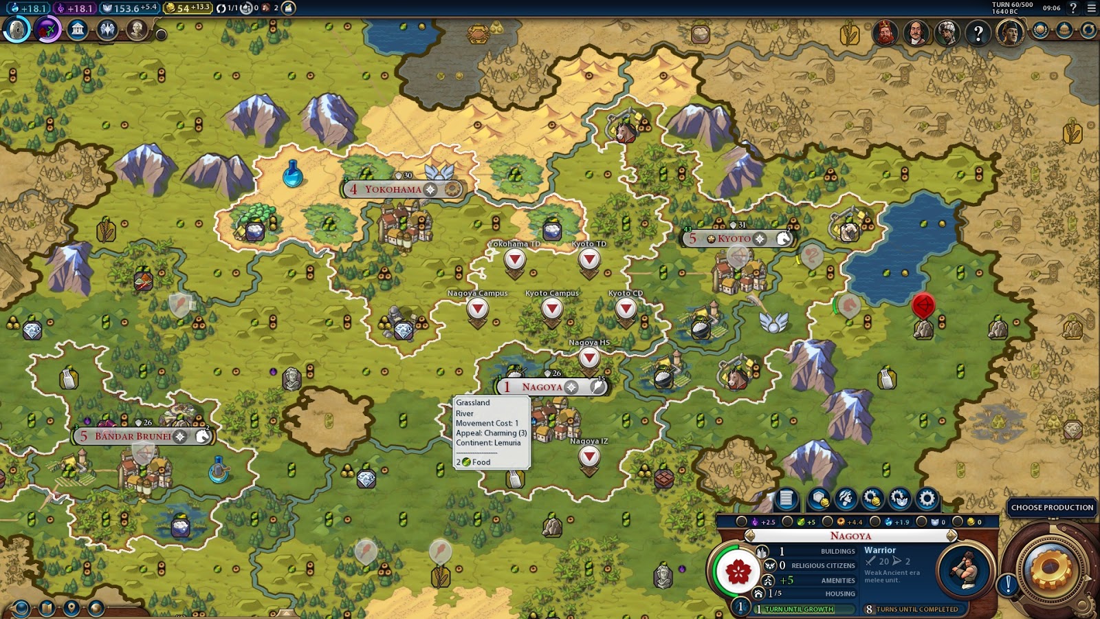 Bandar needs 5 turns to complete a Campus, but Yokohama and Kyoto can go onto settlers straight away. Yokohama is going to leave the horseman in the queue close to completion in case I need it, but I'm hopeful I can save it for a future chop at 75% when I have more builders.