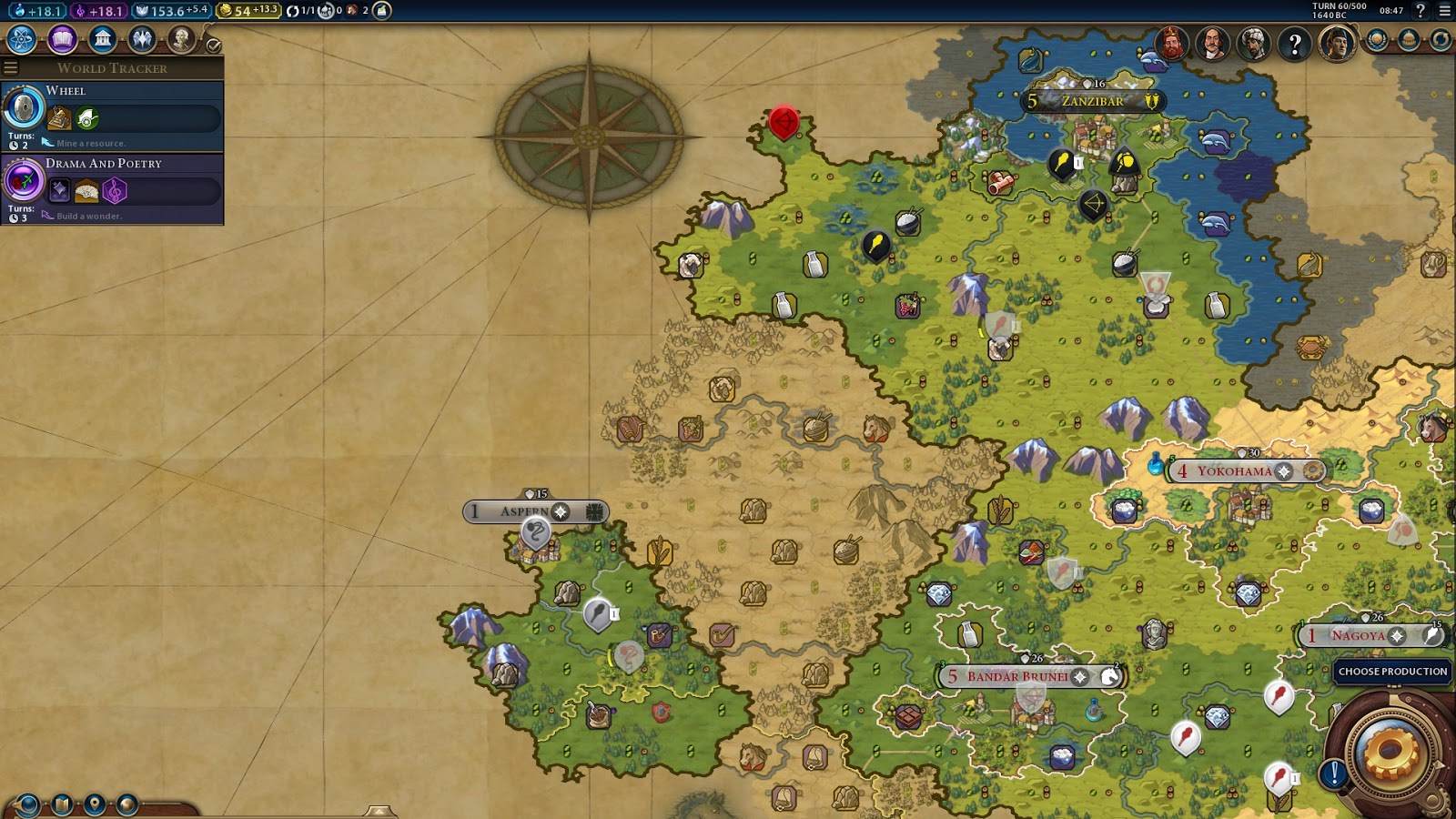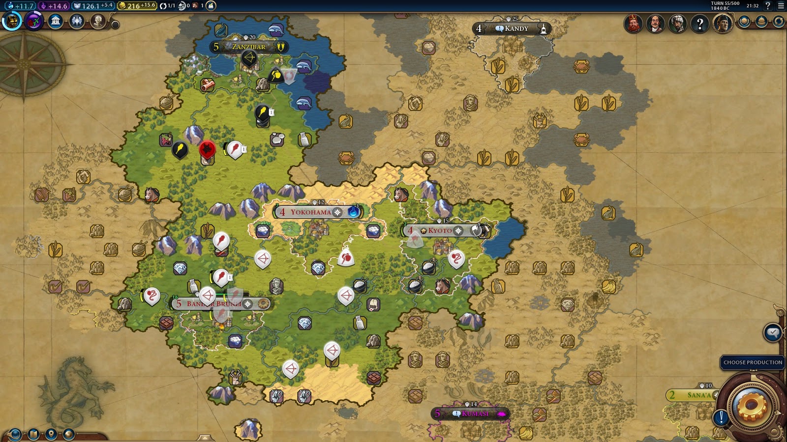 Here is the overview. I've got a settler out to settle on the tea, I think I'll buy a monument again as I need tiles to put down districts. I've just this turn gotten Suzerainity of Zanzibar, so amenities are fantastic. I'm slow to "three" cities, but then I have got 5 archers, 2 slingers and 5 warriors running around. I did get barbwacked earlier as well which is one reason for a slow down, but I could probably have played this better by buying the second horse tile earlier and making a builder at Yokohama instead of most of a granary and some military. if I had done that, Could have gotten into Maneuver with a horseman out and Bandar would not have been at risk. So in general I think the strategy employed can work, but I fucked it up because I've not been able to focus on this game.