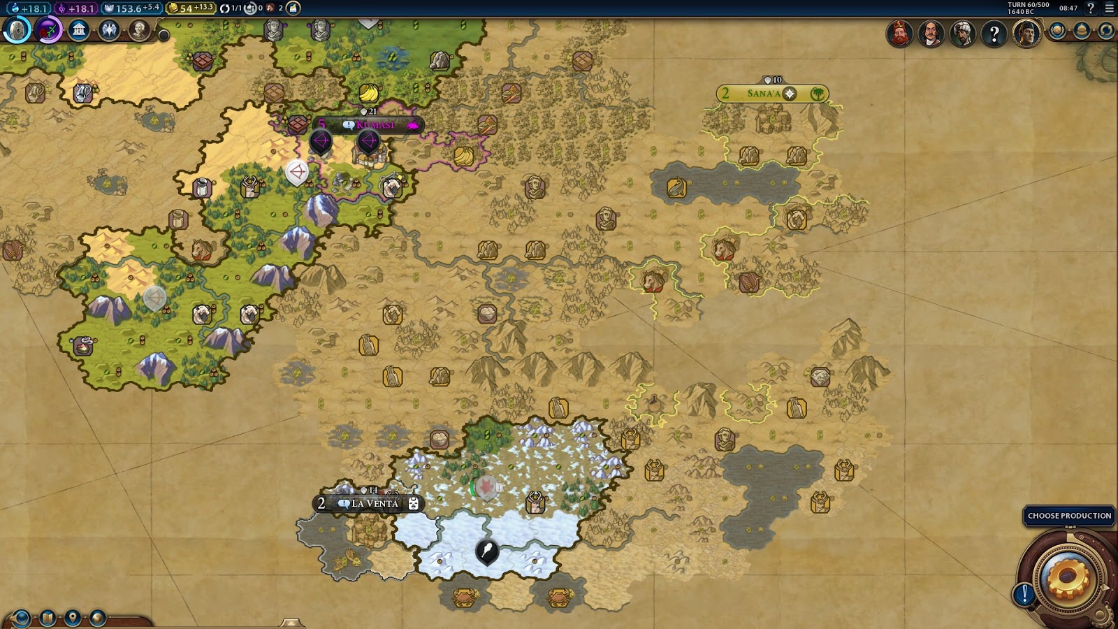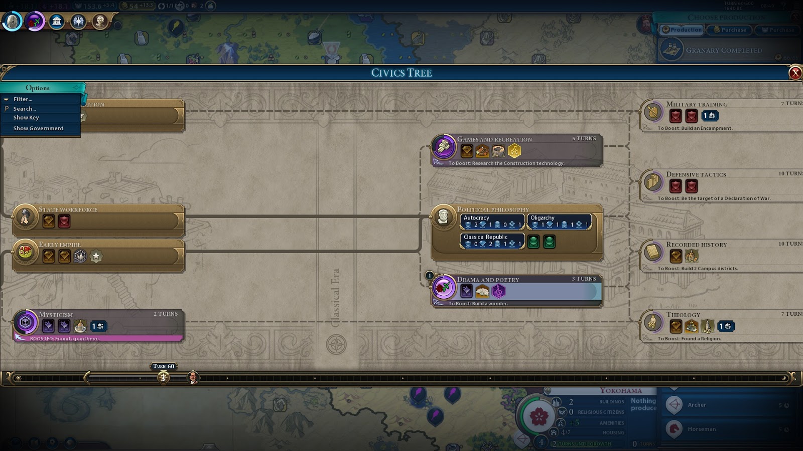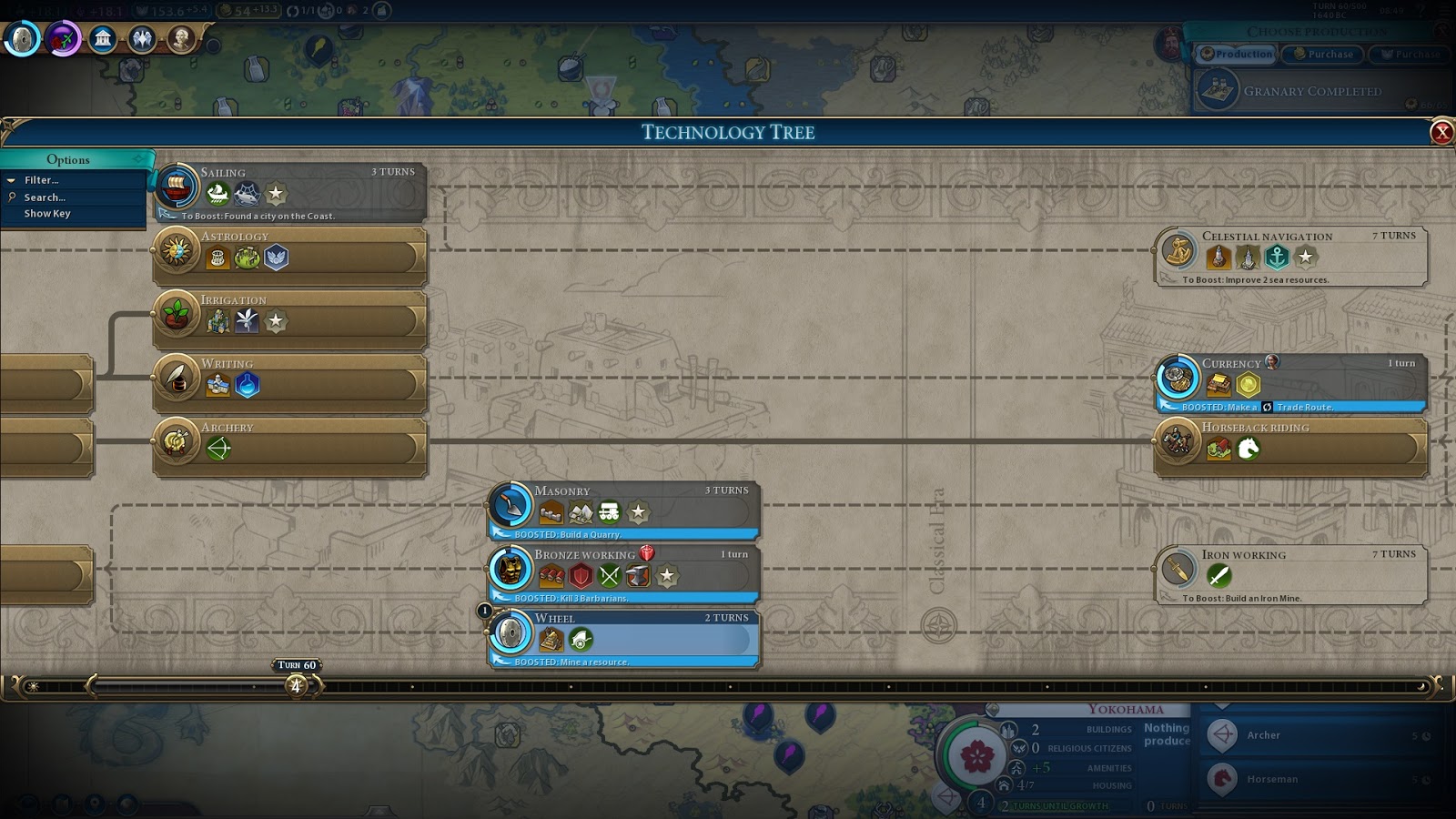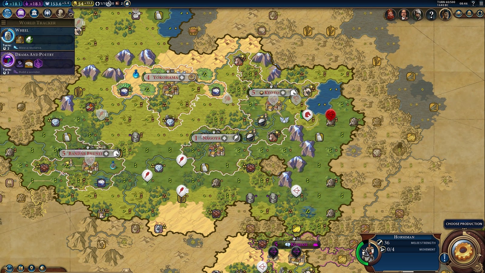My plan is now straight forward. Research Mil Trad T56, hook the second horse tile T57 (I bought it a few turns ago) and swap into Maneuver and work production tiles for 28 production per turn into horsemen in Kyoto. Build 2 horsemen (eot59 and eot62) then back to the settler. Take Kumasi. Yokohama finishes the campus then finishes a granary. Bandar repairs the granary and then builds a settler. That should get me to 7 cities. Then back to district shenanigans with a plan for Iikum workers into Serfdom, but probably need 3 builders before that.