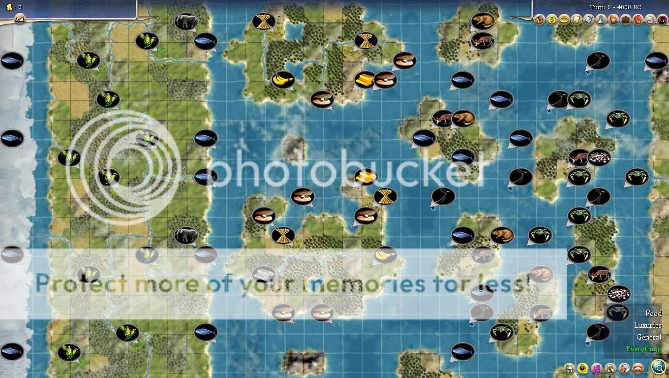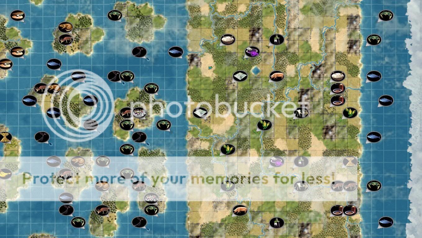 The small ring was created at 8 tiles wide specifically to decrease the amount of living space, and force the players to focus on other avenues of expansion. The river was laid down so that each team will get some easier commerce to fund expansion/tech, but the three parts of the ring that I had to think about were the forests, the food resources, and plains. I knew that I needed each player to settle on the starting location, if anyone moved off the coast, then they were fairly screwed. To support this, I made sure that no player would see another food after they moved their starting warrior, and that they would loses forests as well. The plains I added so that if someone decided to move to get a better bureaucracy capital running more cottages, well, they wouldn't get any more food, and they wouldn't get many more grassland tiles.