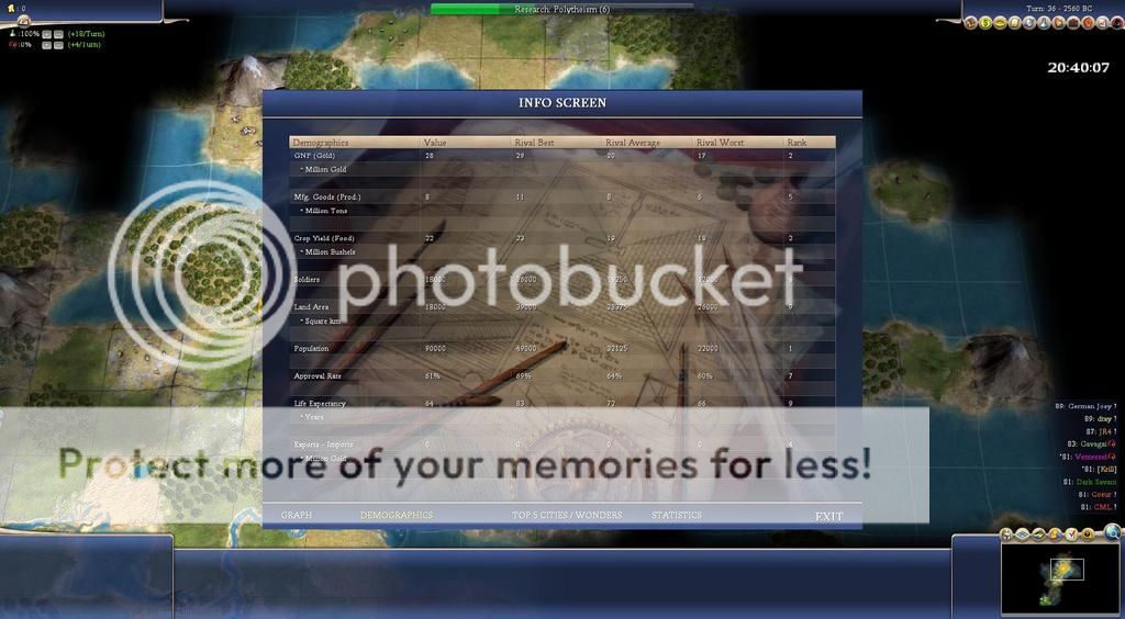 two players have size 4 capitals, I think everyone else has size 3 capitals, meaning that everyone except dtay, Ventessel and myself have no second cities yet, but out of those remaining players I believe Gavagai has a size 1 second city (because I have vision into it) and everyone else has size 2 second cities.