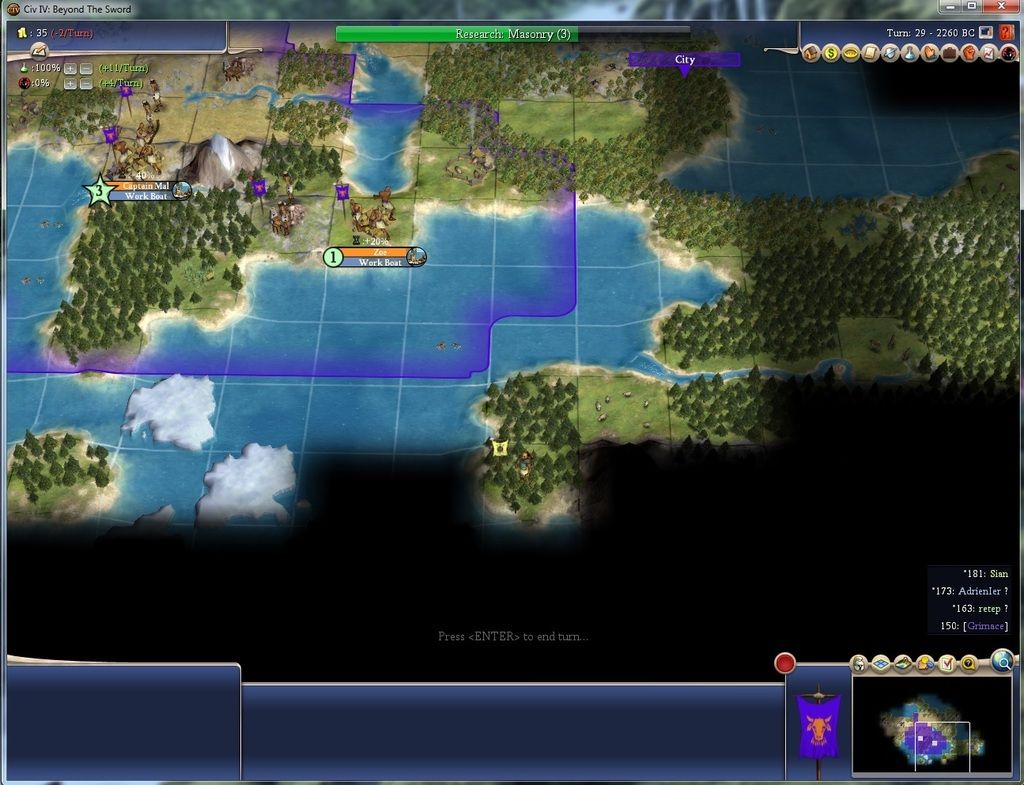 Ran into Sian's scout to my SE. ![]() Settler is on the way to new city location. Finished WB in Captain Mal EOT, building another, then a worker. WB will complete in Zoe (2nd city) next turn, then it will build a warrior to grow, then a worker.
