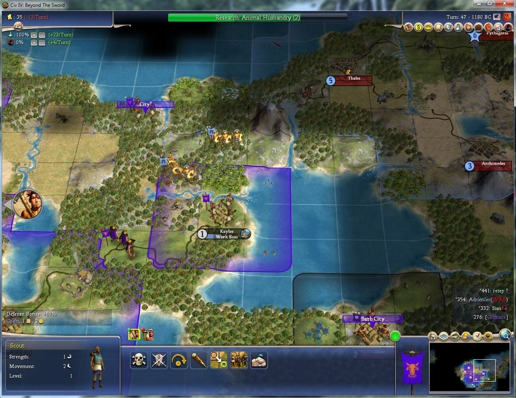 Well, mostly unexciting turns, but a few twists have occurred. On T46 I built my 4th city, Kaylee, at the Gold/Crab/Clam location. And this turn, Adrien must have decided to go after the low-hanging fruit of it, because he moved into its culture with a Phalanx, and followed it up with a Phalanx and a Settler. ![]() I'm not exactly sure why he did it...maybe he thought because I just had a warrior as the garrison he'd be able to raze it easily and I wouldn't be able to do anything about it? Which to a certain extent is true -- there's nothing I can do to stop him from razing it. I gambled that he wouldn't start a war over a city that is not intruding on his sphere of influence (no pink dots here!) because my Vulture would not make it there until T48 (and I lack the money for a quick upgrade of the warrior). To me it seems like a bad decision...a war this early doesn't benefit either of us and he has plenty of options for expansion, but if he razes it I kind of have to retaliate in kind. Anyway, I sent him a peace treaty offer just to see if he takes it...most likely he won't, but what the hell. So there are a two ways this could go: - Adrian attacks across the river from where his phalanx is and kills my warrior, razing the city. Hopefully the RNG is kind to me and his phalanx is damaged, and my vulture moves forward to kill his phalanx. Not sure where he will move his second phalanx/settler...probably to wherever he wants to build. Maybe he's planning to pink dot me right where my city is? Anyway, my second vulture is 1t behind the first, so if he does that my vultures have even odds against his phalanxes, not counting fortify odds, and if my first vulture is not too badly damaged I have a decent chance of then screwing his phalanx/settler. - Adrien moves his phalanx across the river onto the gems hill to get the best odds and sees my vulture, which will move into the city the next turn. Even attacking onto flat land, he has 50% odds, so it's a bigger risk at that point. Even if he moves his other phalanx/settler forward, there's no guarantee he can take the city, and if he doesn't his settler is in dangerous territory. I'm hoping the second option is what occurs, because I think it gives me the best odds to keep the city (and who wants to throw a settler away?), but he's created bad blood between us for no reason. That really irritates me. It's just such a pointlessly opportunistic attack when there is no long-term benefit to doing so. I can only assume he doesn't think I have better troops than warriors, because that is the only thing that makes this remotely logical, but he has to know I have BW and since this is not a random map and I had 3 cities he has to assume I have access to copper.Oh well, we'll see what happens! |