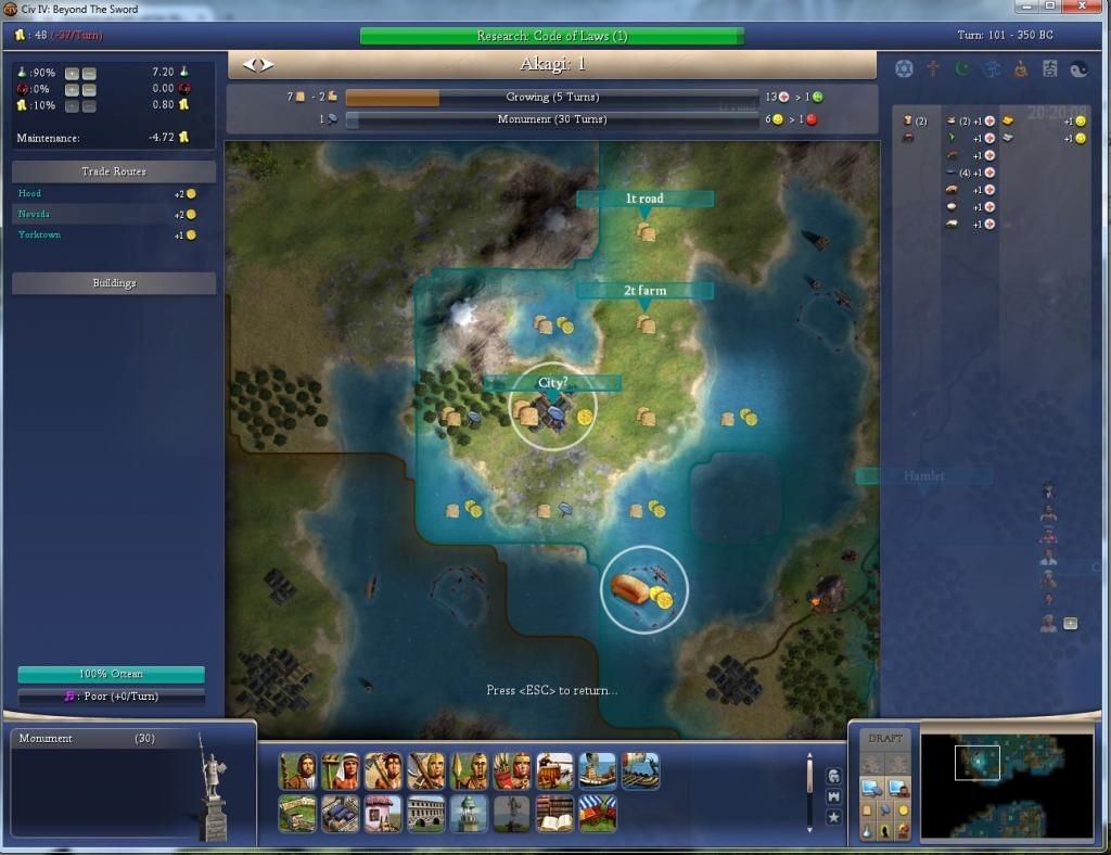 I borrowed the fish from Yorktown to grow to size 2 so we can whip the monument fast; Yorktown is building a granary and will finish it the same turn Akagi grows to size 2.