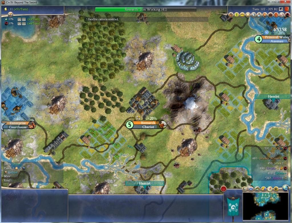 Big E finished its worker and started on a Settler. Yamato switched off wealth and started building a Courthouse (4 turns), which will save us over 2gpt in maintenance. Bismarck switched off wealth and I set it to build 2 chariots and then a courthouse, because we still need some more units. Axe is almost to Akagi for defense (though it has the warrior there in the forest for emergencies). Settler is in place to build the elephant city next turn.