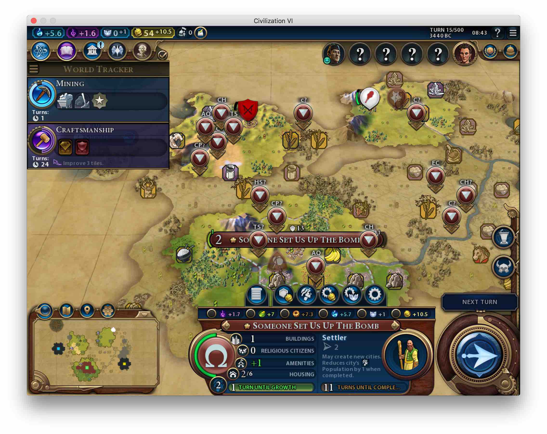 CMF got his 2nd civic. Changed to agoge. kept UP. Now next turn I will switch from the 1/3 to the 3/1 wheat and will still complete settler in same time.