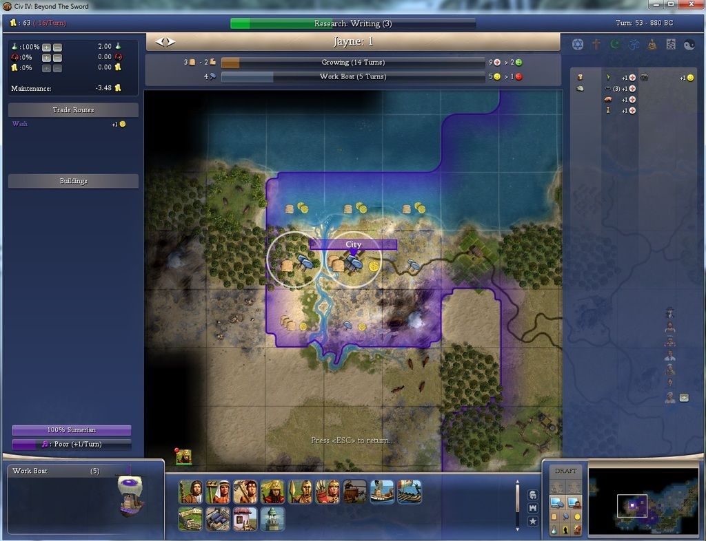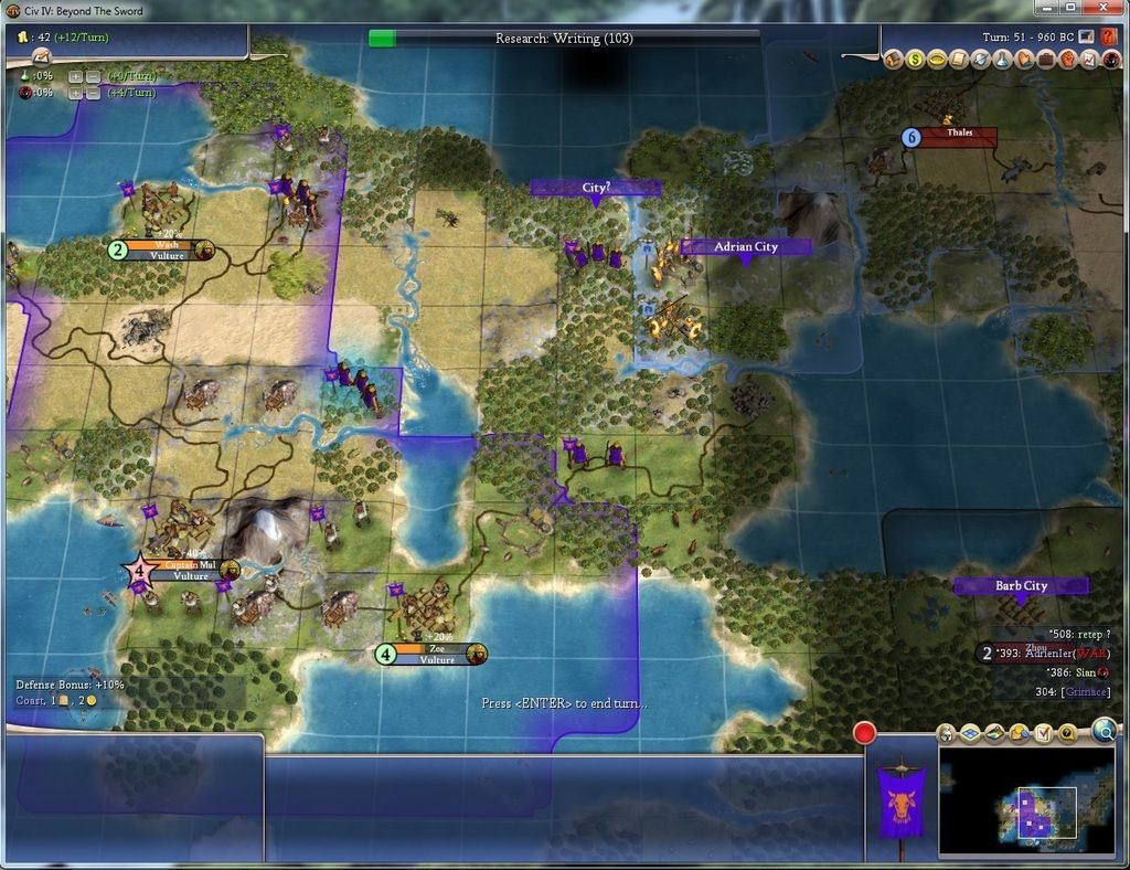 The vulture 2NE of Zoe just killed a barb warrior for 1XP and suffered some damage. The vulture 2NE of Captain Mal was just produced. And a third vulture is coming East from Wash. The idea is to concentrate all of my vultures in the one tile those two currently occupy, 2W of Adrian's city. After the next round of vultures, I'm going to build 2 spears as I noticed he has horses in his borders right now, which means I will likely see Chariots fairly soon.
