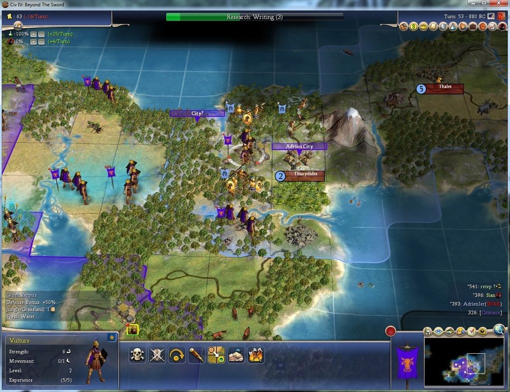Adrien offered me peace twice again this turn. Declined both. I think he may be regretting his decision to start this war now, because his expansion (and mine, as well) is going to be drastically hampered. I just don't care as much, since it's the principle of the thing. I don't want to lose the game, but at the same time I play my personality, and unnecessary harm done to me or mine is one thing that I will hold a huge grudge over. So I sent him back an offer for peace in exchange for his city again.